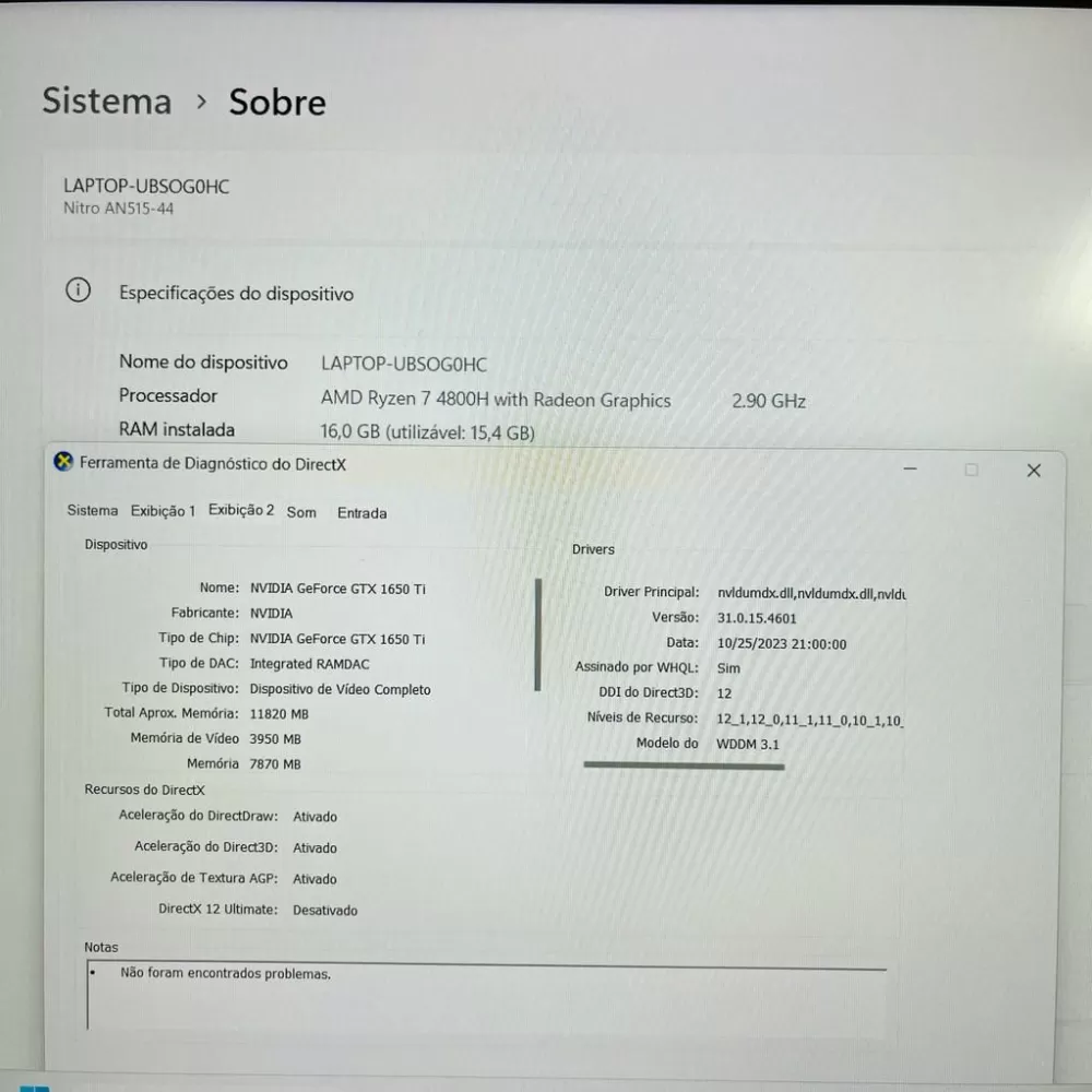 Notebook Acer Nitro Ryzen 7 4800H - 16Gb Ram - GTX 1650ti - SSD