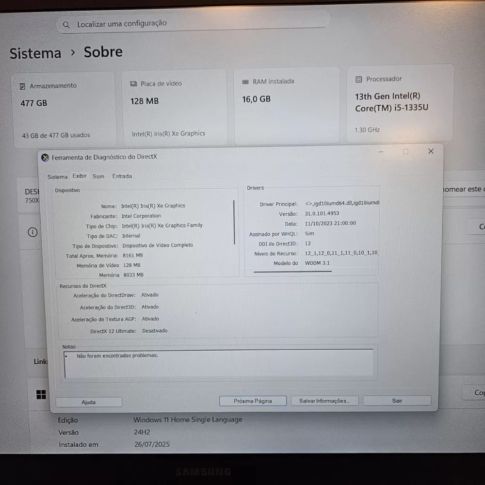 Notebook Samsung GalaxyBook4 i5 13th - 16Gb Ram - Intel Iris Xe - 512Gb SSD