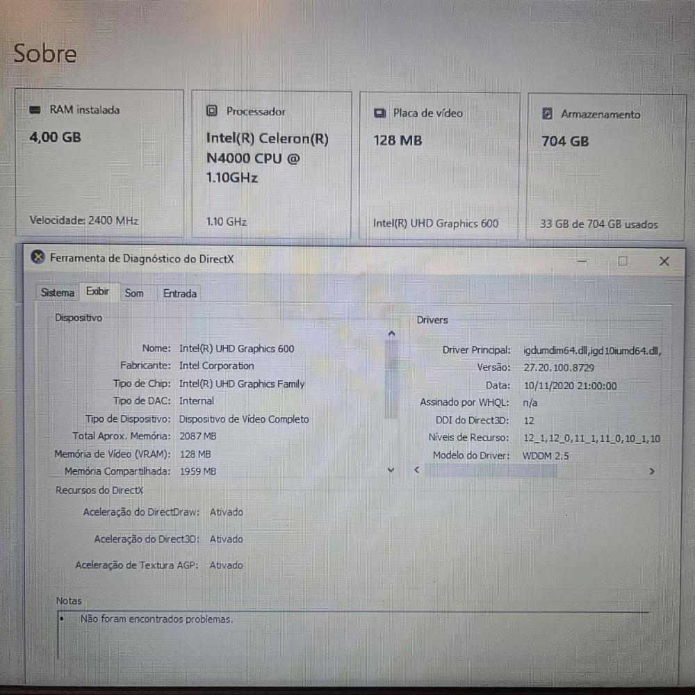 Intel Celeron N4000 – 4 MB de cache 2 núcleos e 2 threads – de 1.10 GHz até 2.60 GHz (Similar ao i3 7th)
