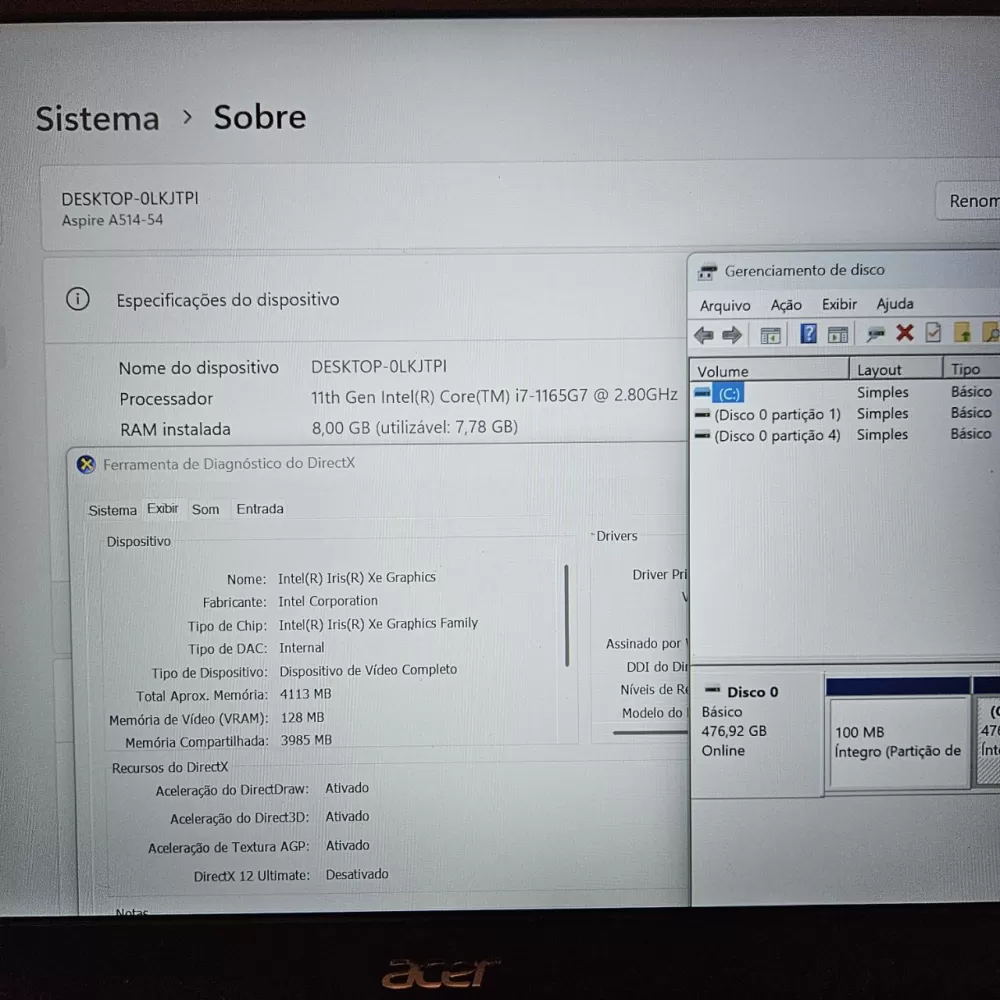 Notebook Acer i7 11th - 8Gb Ram - Intel Iris Xe - 512Gb SSD