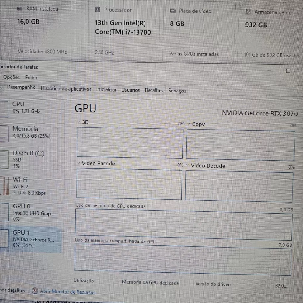 Pc Gamer i7 13th - 16Gb Ram - RTX 3070 (8Gb) - 1Tb SSD