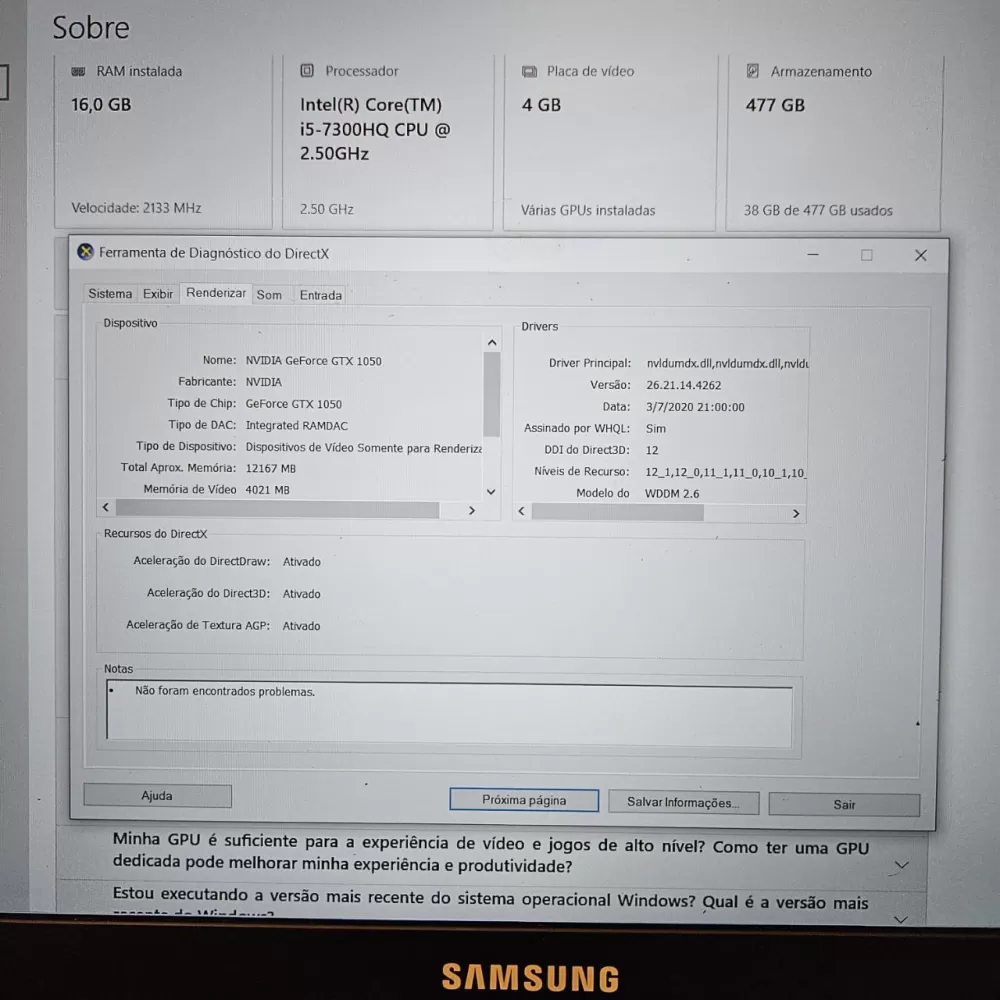 Notebook Samsung Odyssey i5 7th - 16Gb Ram - GTX 1050 - 512Gb SSD