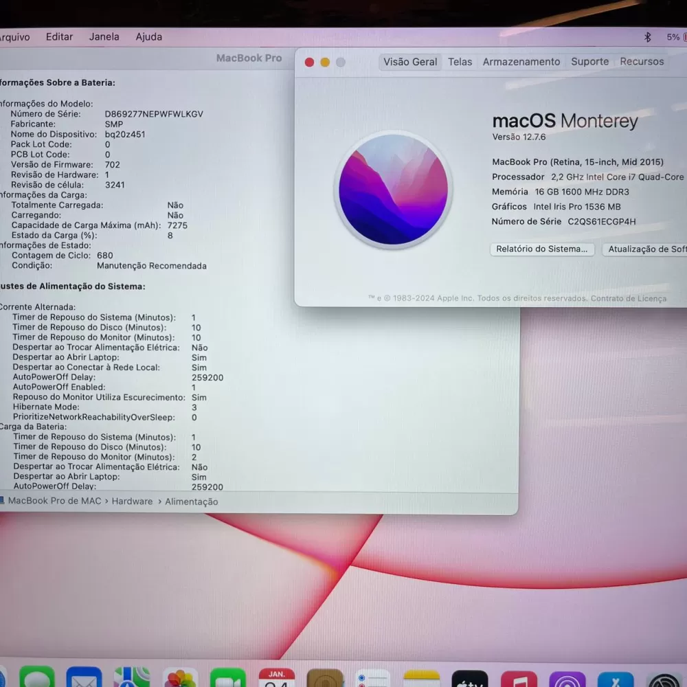 Tela de 15,4 polegadas (na diagonal) retroiluminada por LED, com tecnologia IPS; resolução nativa de 2880 x 1800 com 220 pixels por polegada e suporte a milhões de cores