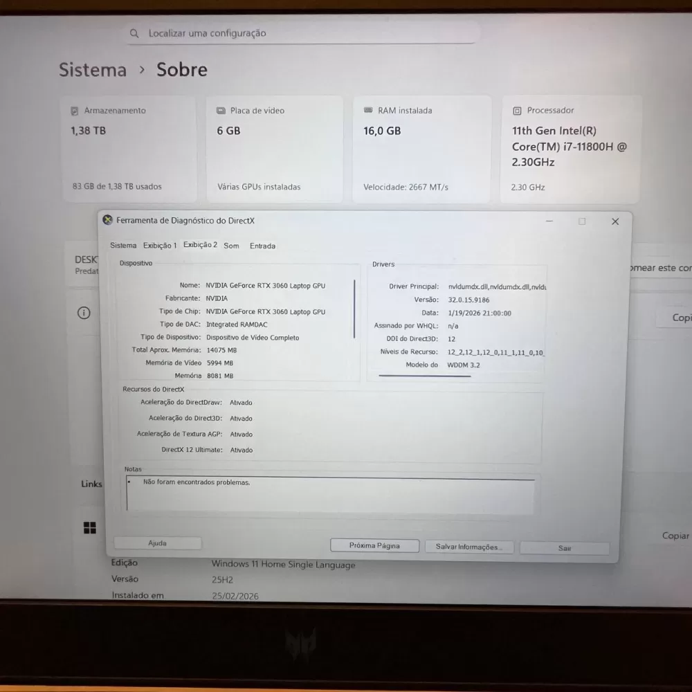 Notebook Acer Predator i7 11th - 16Gb Ram - RTX 3060 (6Gb) - 512Gb SSD e 1Tb HD