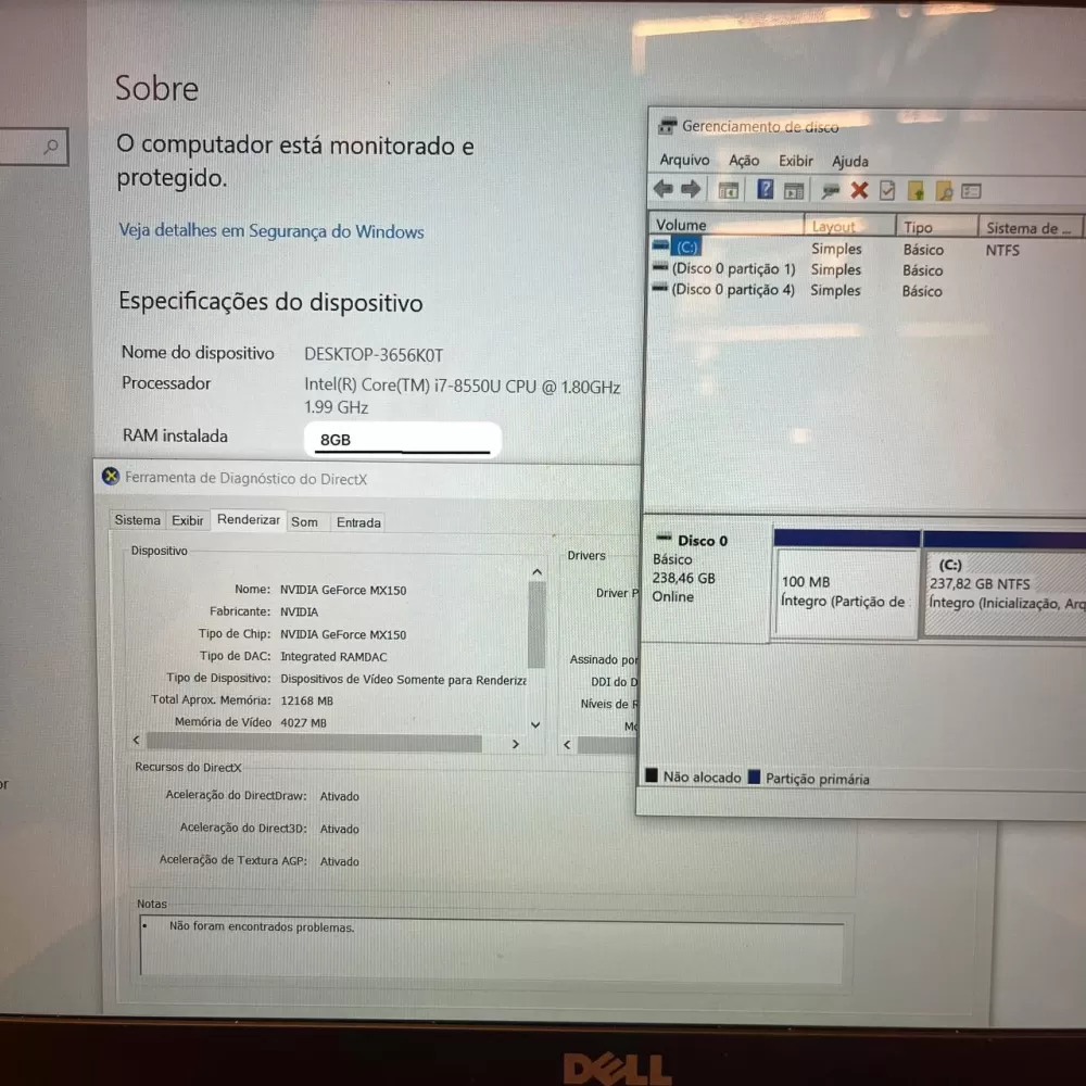 Notebook Dell i7 8th - 8Gb Ram - GeForce MX150 - SSD