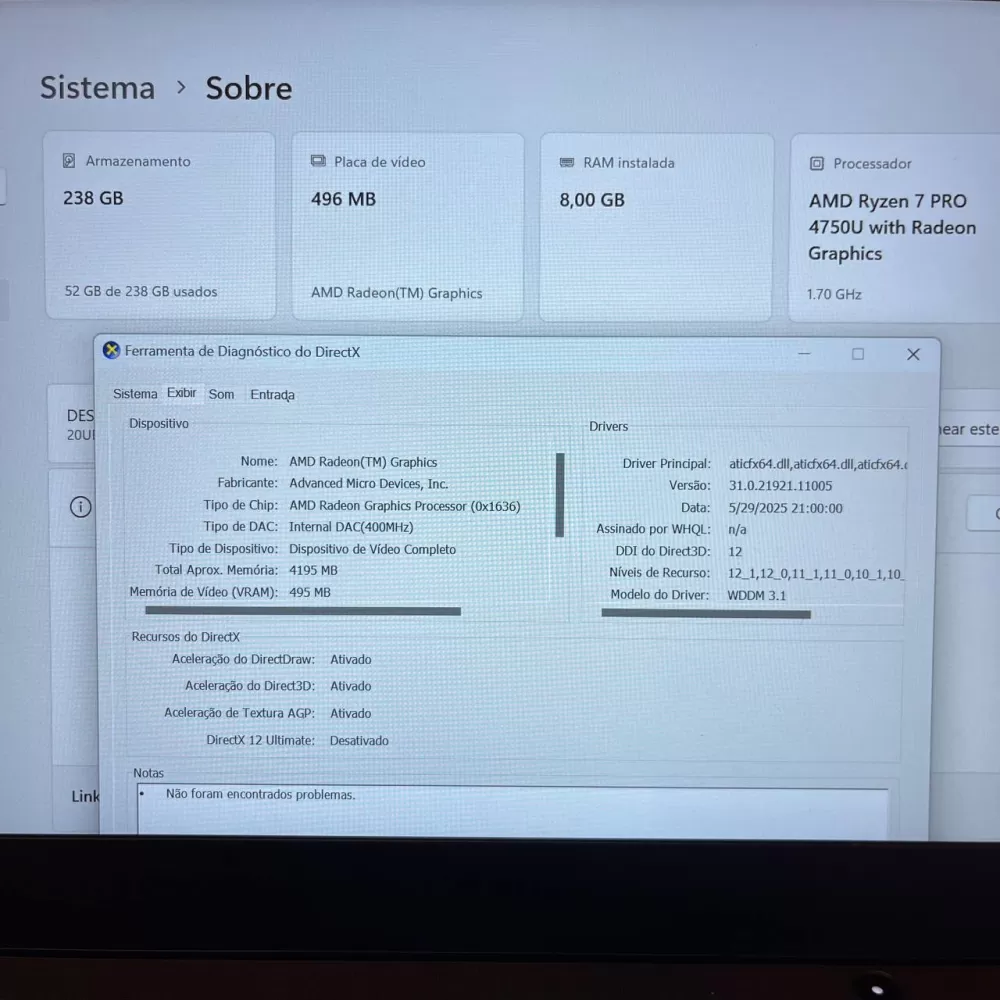 Notebook ThinkPad Ryzen 7 PRO 4750U - 8Gb Ram - RX Vega 7 - SSD