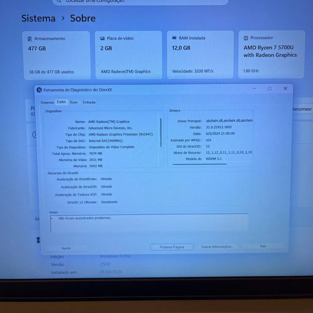 Notebook Lenovo Ryzen 7 5700U - 12Gb Ram - Vega 8 - 512Gb SSD
