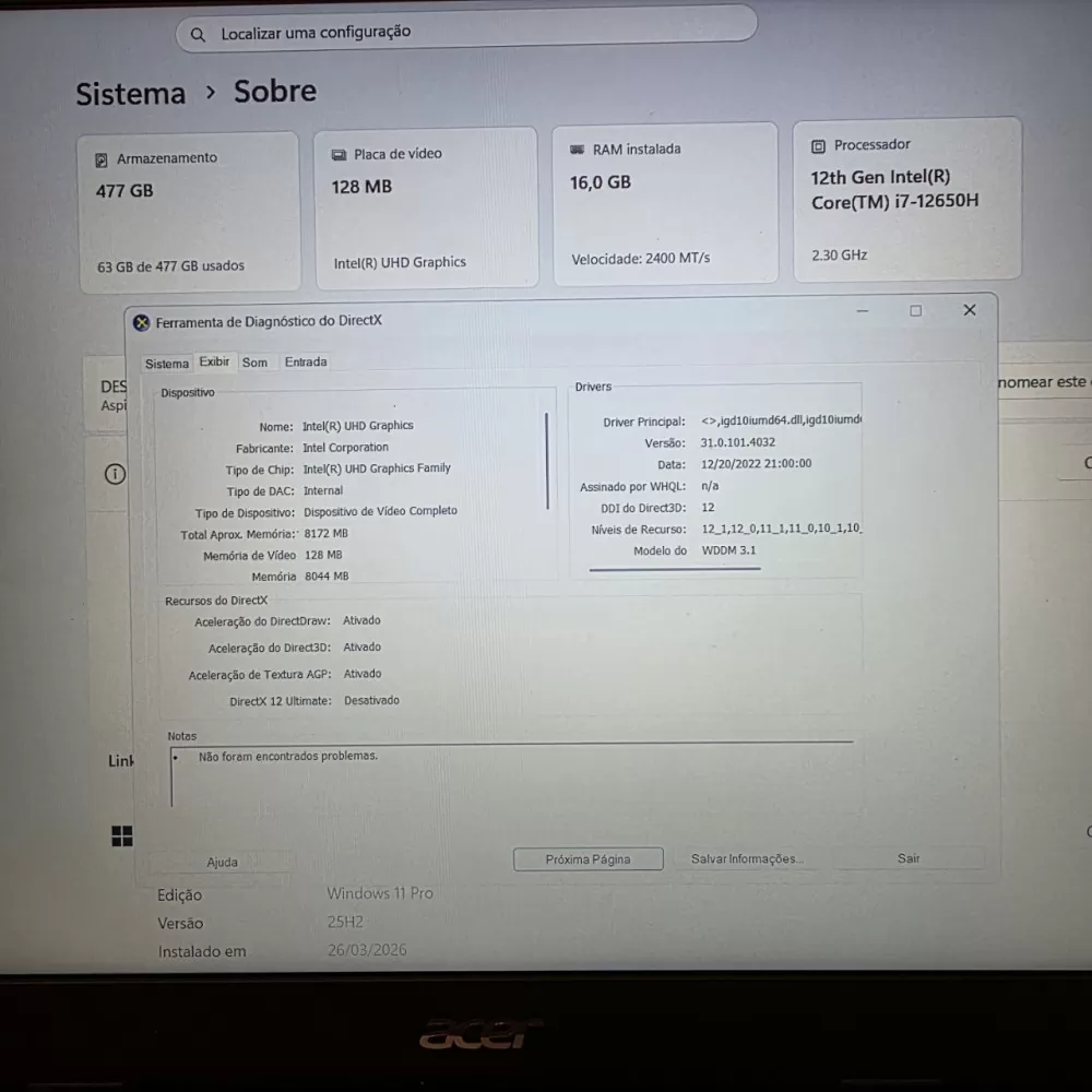 Notebook Acer i7 12th - 16Gb Ram - 512Gb SSD