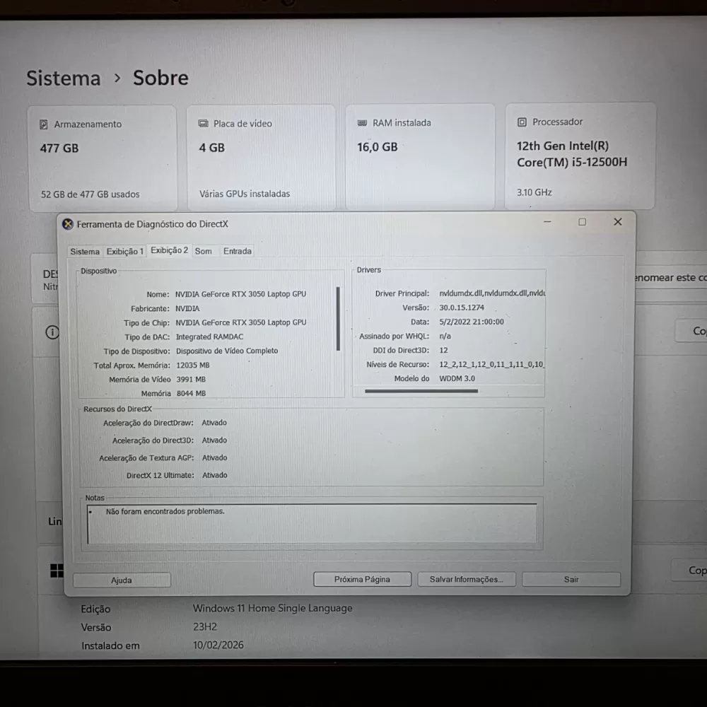 Notebook Acer Nitro 5 i5 12th - 16Gb Ram - RTX 3050 - 512Gb SSD